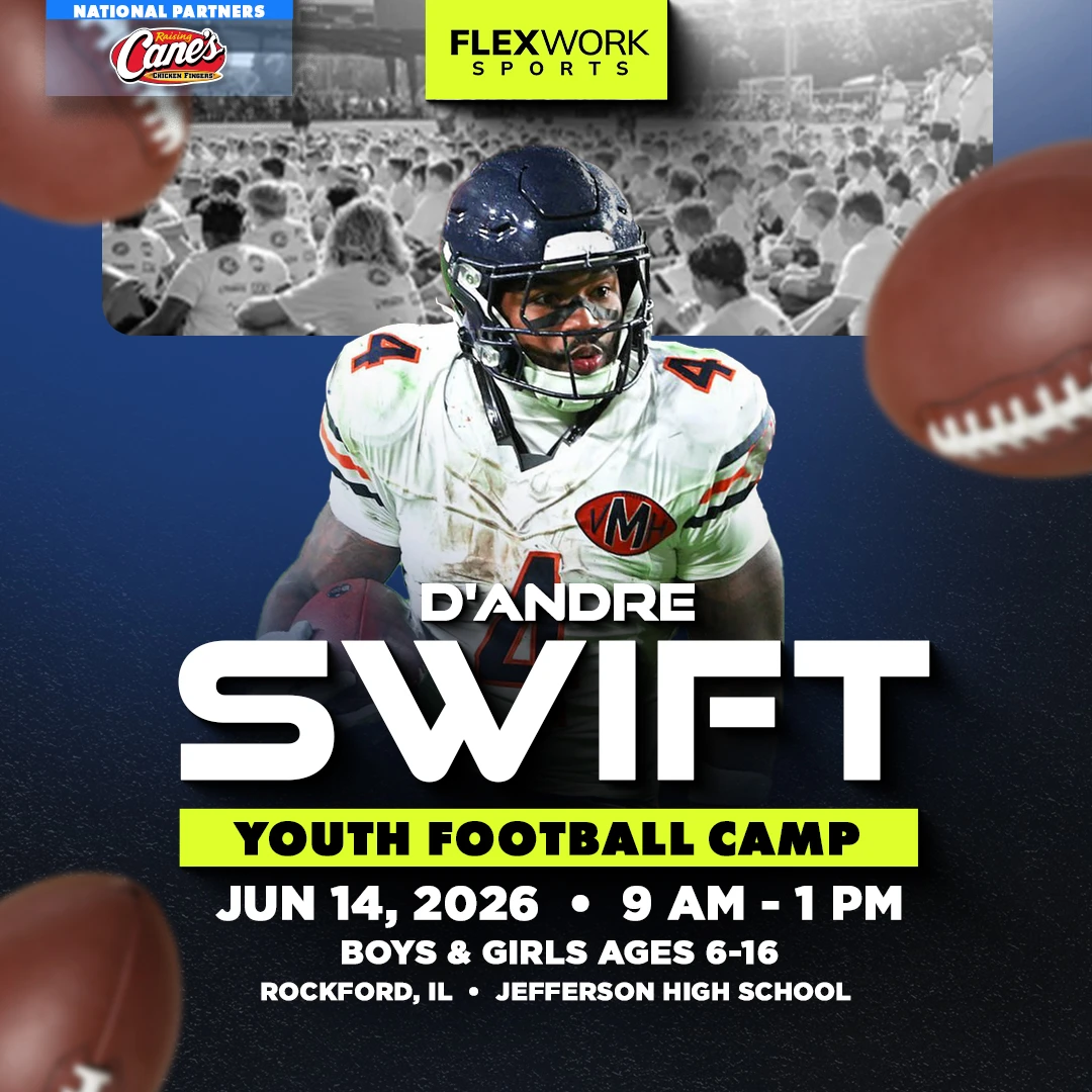 Over the course of the day, Chicago RB D'Andre Swift and our FlexWork Sports coaches will guide your child through an exciting, high-energy day designed around fun and unforgettable experiences on the field. Camp activities include interactive sessions, skill stations, and unique opportunities to connect with our athletes in ways that make the game come alive.