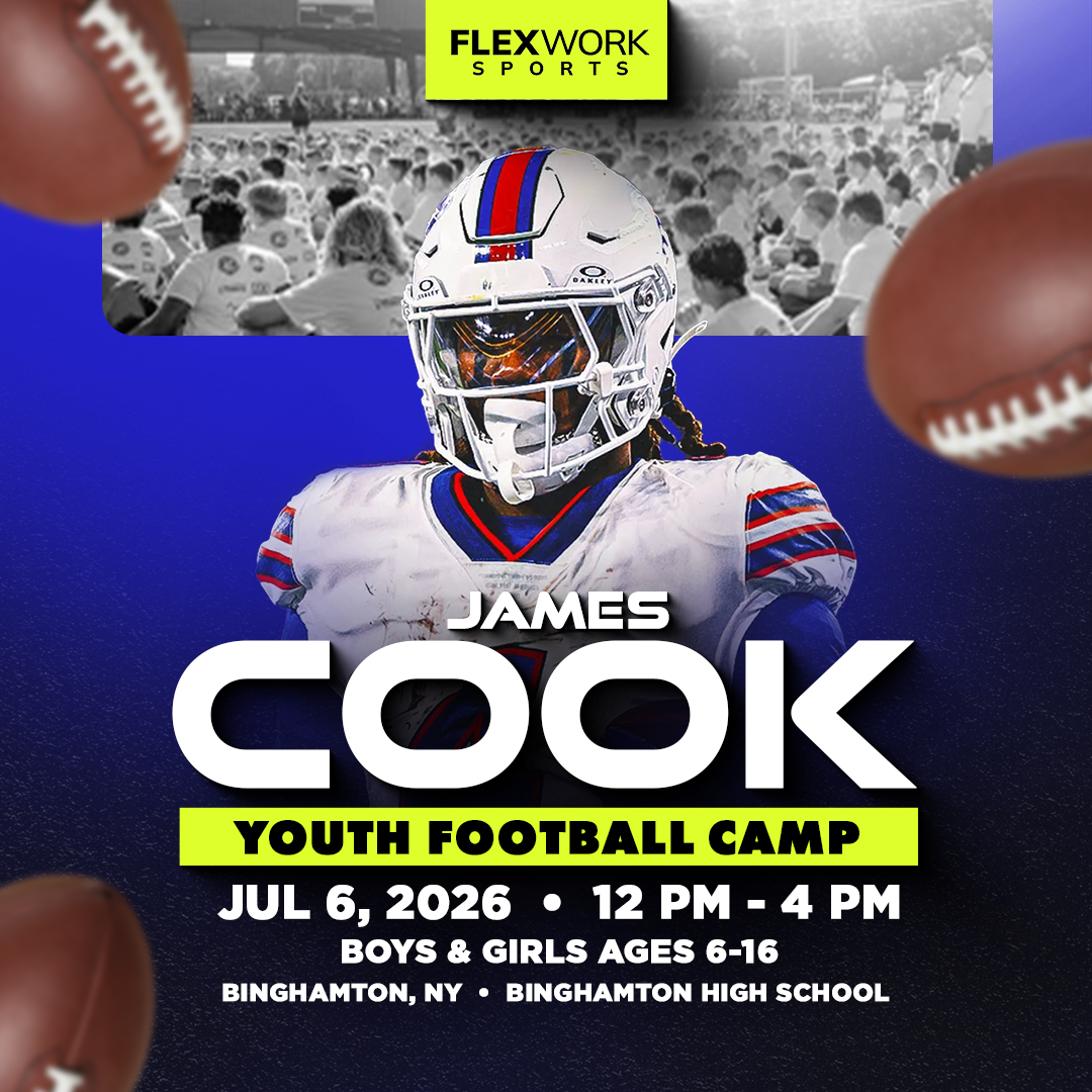 Over the course of the day, Buffalo star RB James Cook and our FlexWork Sports coaches will guide your child through an exciting, high-energy day designed around fun and unforgettable experiences on the field. Camp activities include interactive sessions, skill stations, and unique opportunities to connect with our athletes in ways that make the game come alive.
