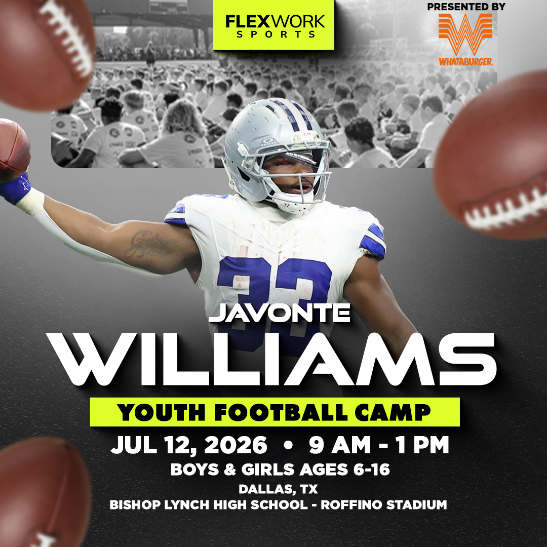Over the course of the day, Dallas star RB Javonte Williams and our FlexWork Sports coaches will guide your child through an exciting, high-energy day designed around fun and unforgettable experiences on the field. Camp activities include interactive sessions, skill stations, and unique opportunities to connect with our athletes in ways that make the game come alive.