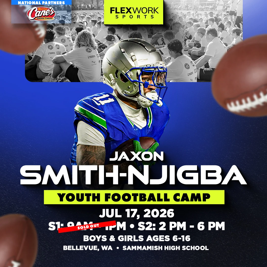 Over the course of the day, Seattle star wide receiver Jaxon Smith-Njigba and our FlexWork Sports coaches will guide your child through an exciting, high-energy day designed around fun and unforgettable experiences on the field. Camp activities include interactive sessions, skill stations, and unique opportunities to connect with our athletes in ways that make the game come alive.