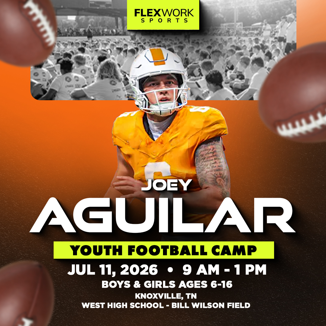Over the course of the day, Tennessee star QB Joey Aguilar and our FlexWork Sports coaches will guide your child through an exciting, high-energy day designed around fun and unforgettable experiences on the field. Camp activities include interactive sessions, skill stations, and unique opportunities to connect with our athletes in ways that make the game come alive.