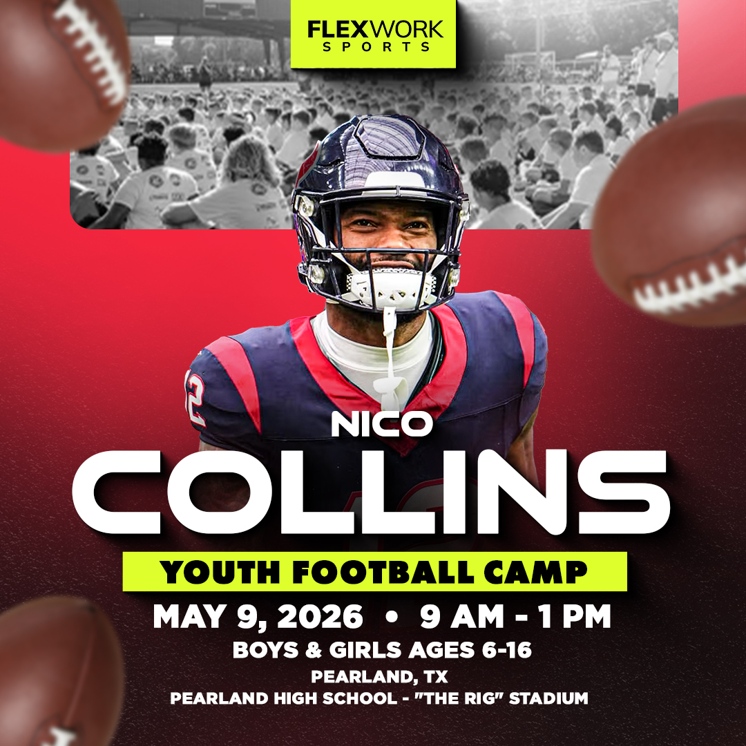 Over the course of the day, Houston WR Nico Collins and our FlexWork Sports coaches will guide your child through an exciting, high-energy day designed around fun and unforgettable experiences on the field. Camp activities include interactive sessions, skill stations, and unique opportunities to connect with our athletes in ways that make the game come alive.