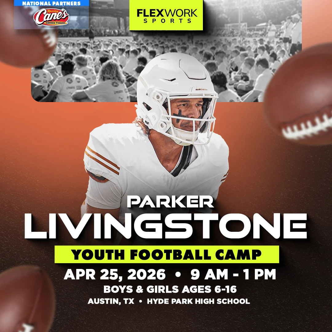 Over the course of the day, Texas Wide Receiver Parker Livingstone and our FlexWork Sports coaches will guide your child through an exciting, high-energy day designed around fun and unforgettable experiences on the field. Camp activities include interactive sessions, skill stations, and unique opportunities to connect with our athletes in ways that make the game come alive.
