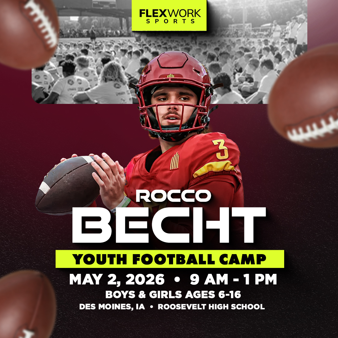 Over the course of the day, Iowa State QB Rocco Becht and our FlexWork Sports coaches will guide your child through an exciting, high-energy day designed around fun and unforgettable experiences on the field. Camp activities include interactive sessions, skill stations, and unique opportunities to connect with our athletes in ways that make the game come alive.