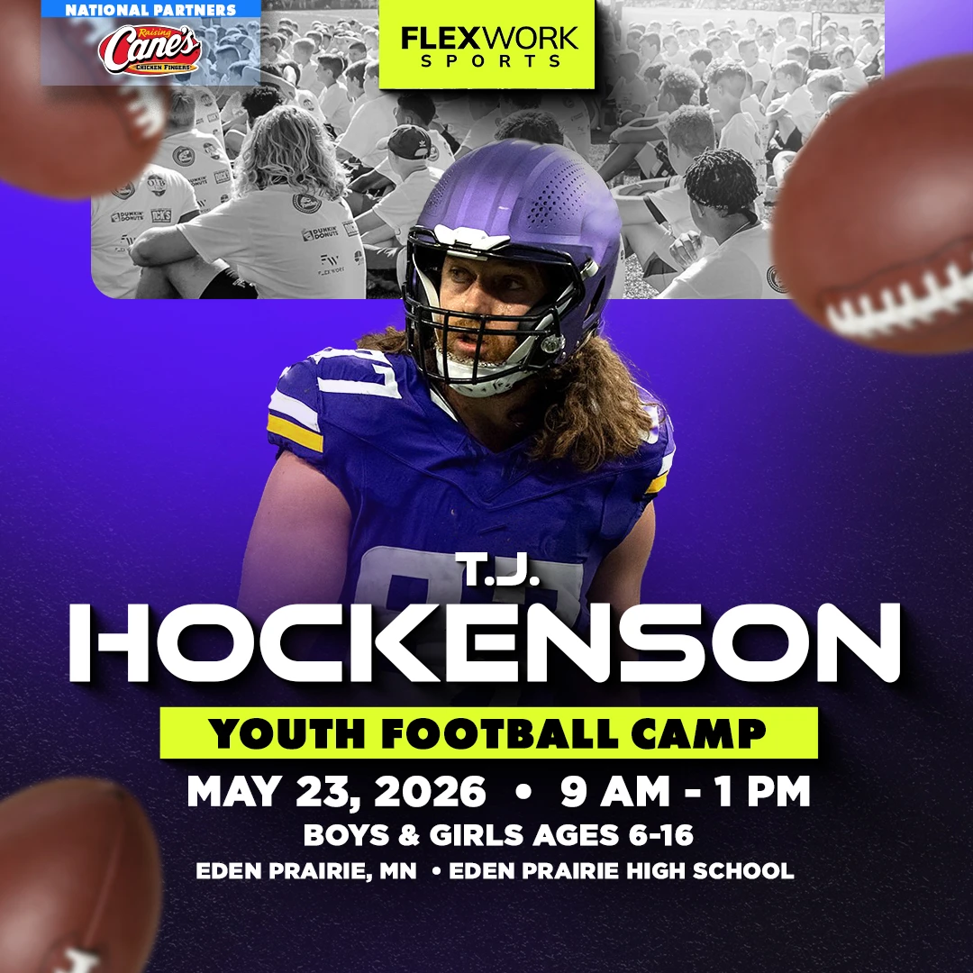 Over the course of the day, Minnesota star tight end T.J. Hockenson and our FlexWork Sports coaches will guide your child through an exciting, high-energy day designed around fun and unforgettable experiences on the field. Camp activities include interactive sessions, skill stations, and unique opportunities to connect with our athletes in ways that make the game come alive.