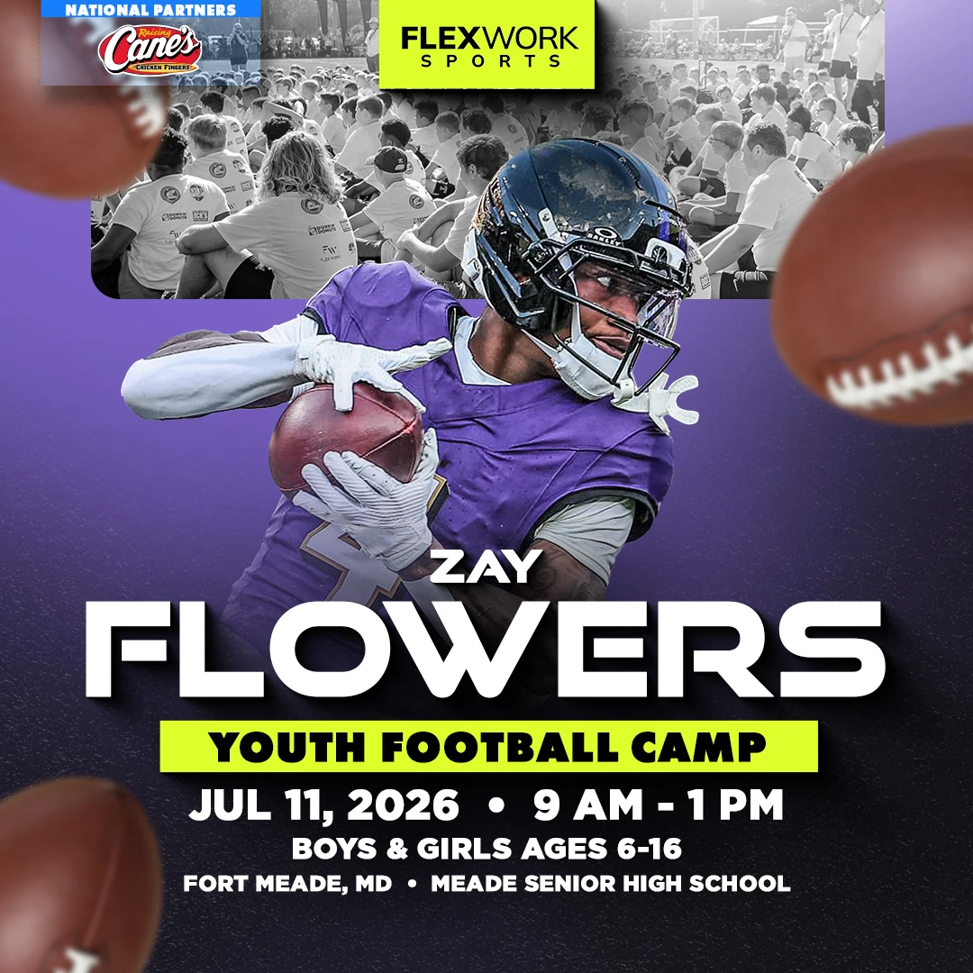 Over the course of the day, Baltimore star wide receiver Zay Flowers and our FlexWork Sports coaches will guide your child through an exciting, high-energy day designed around fun and unforgettable experiences on the field. Camp activities include interactive sessions, skill stations, and unique opportunities to connect with our athletes in ways that make the game come alive.